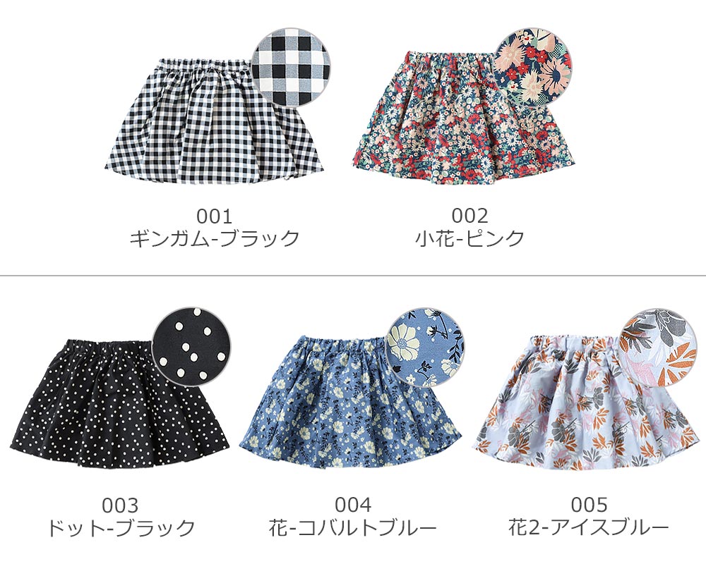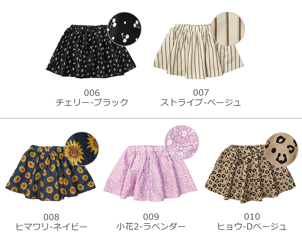 サイズ表 cm 80cm 90cm 95cm 100cm 110cm 120cm 130cm 140cm 150cm 160cm ウエスト 40 41 42 44 46 49 52 54 57 59 スカート丈 21 23 25 27 29 31 33 35 38 41 インナーパンツ丈 21 23 25 27 29 31 33 35 38 41 股下 2.5 3 3 3.5 3.5 3.5 4.5 5.5 6 6.5 >>サイズガイド